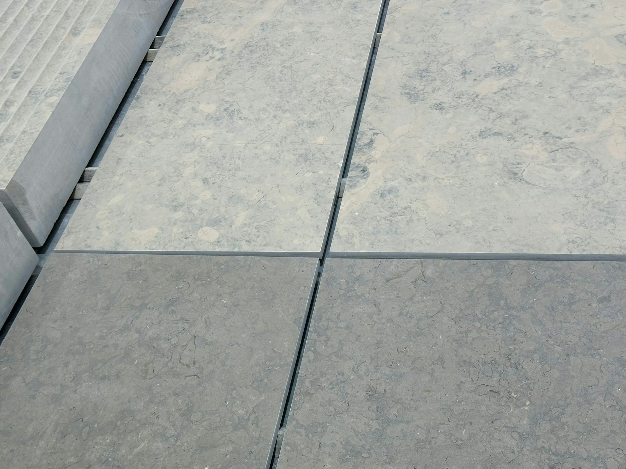 The most obvious is color —finding a stone that matches the shade and tone. Our team will examine and consider many samples with similar mineral content, looking for options that best match the original stone. Beyond color, there are unique stone characteristics. Some are unsightly blemishes to avoid, like ferrous inclusions, while others, such as fossil imprints, can be interesting elements worth highlighting. The quality of the quarry is just as important as the stone. When it comes to matching materials, finishing is a major consideration. Some finishes, like a honed style, are simple, but other more advanced finishes can be difficult to replicate consistently.