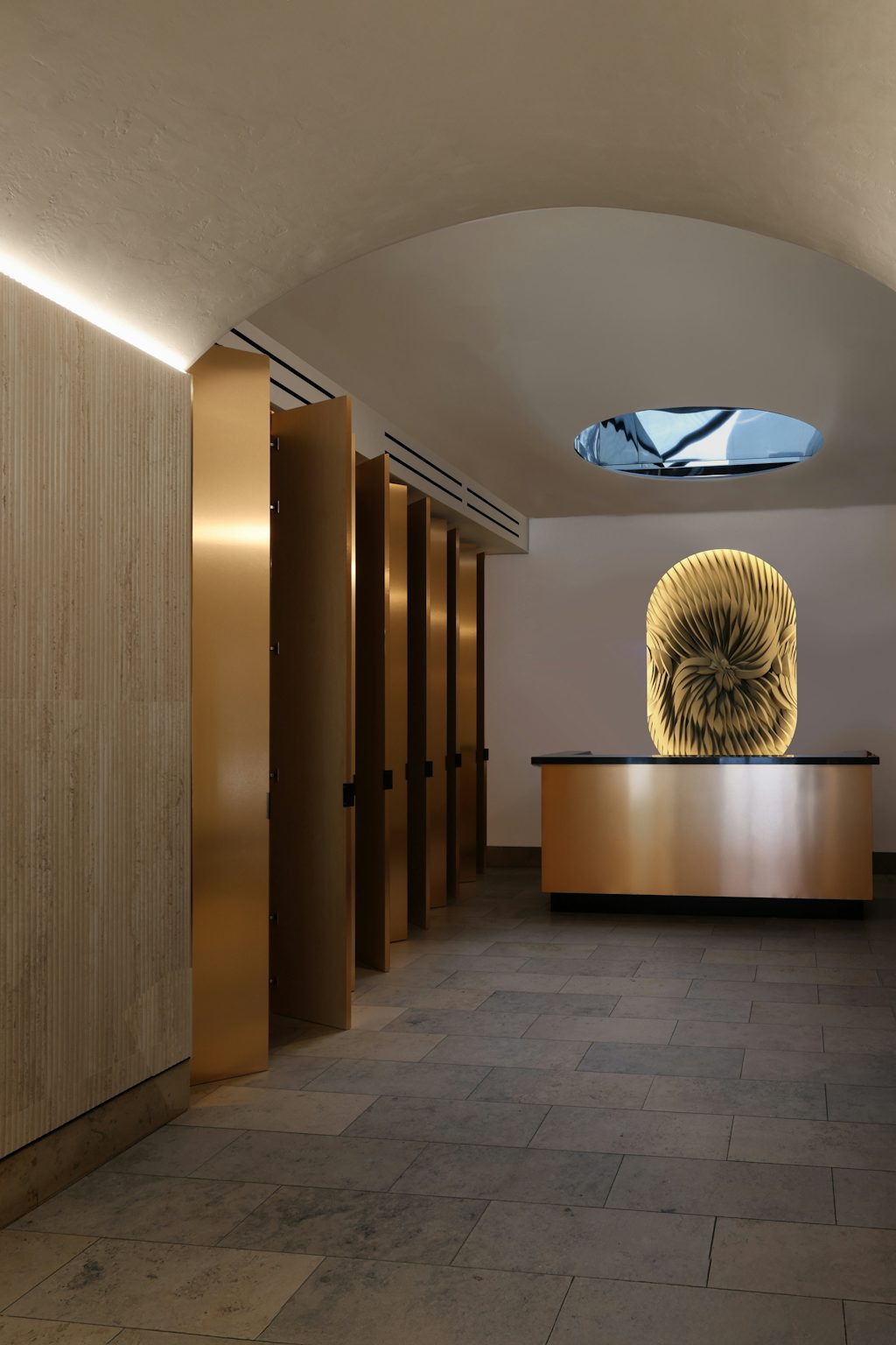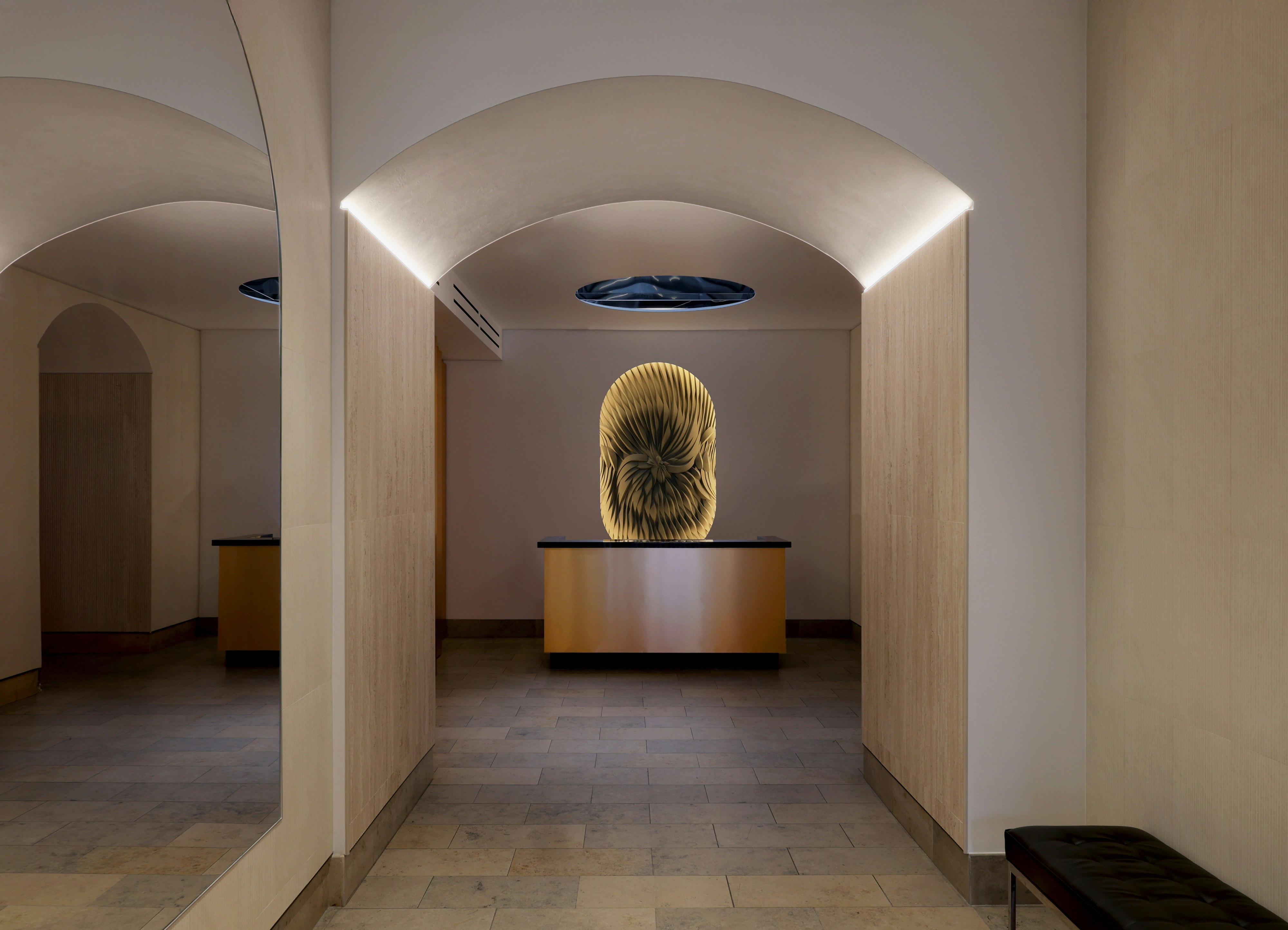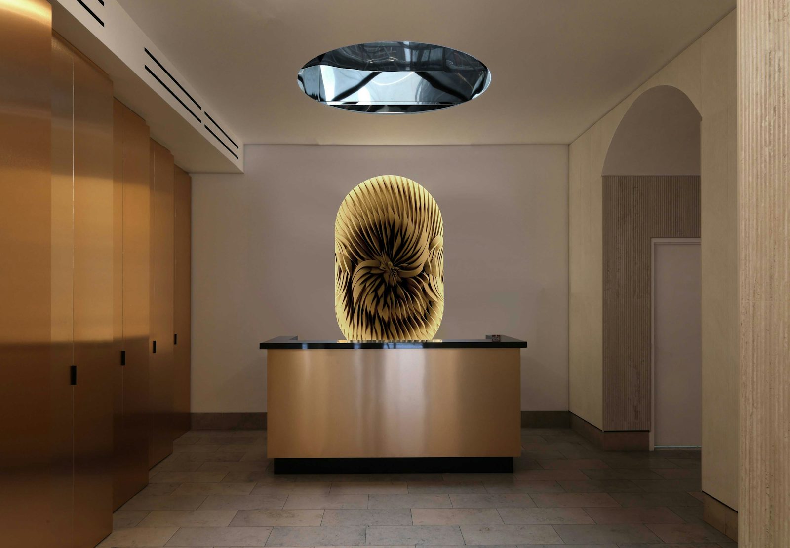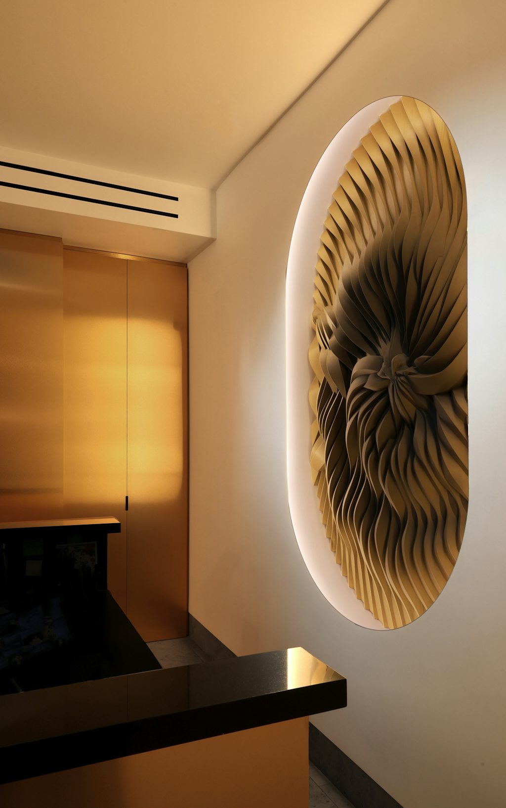 A defining feature of the renovated lobby is a custom 3D-printed architectural surface, designed to add depth and artistry to the space.