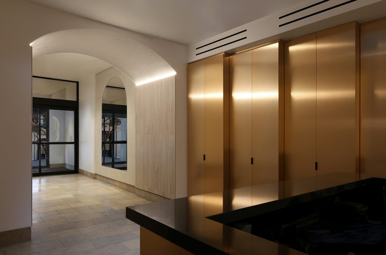 By re-aligning architectural elements, we resolved longstanding geometric inconsistencies, creating a balanced and visually striking entryway. The introduction of vertical fluted tiles under the vaults adds depth and sophistication, while reflective materials around the skylight cleverly conceal existing irregularities. Warm-toned finishes enhance the ambiance, making the space both inviting and timeless. Despite construction constraints, EDG delivered a high-end design that elevates the building’s character and enhances the everyday experience for residents.