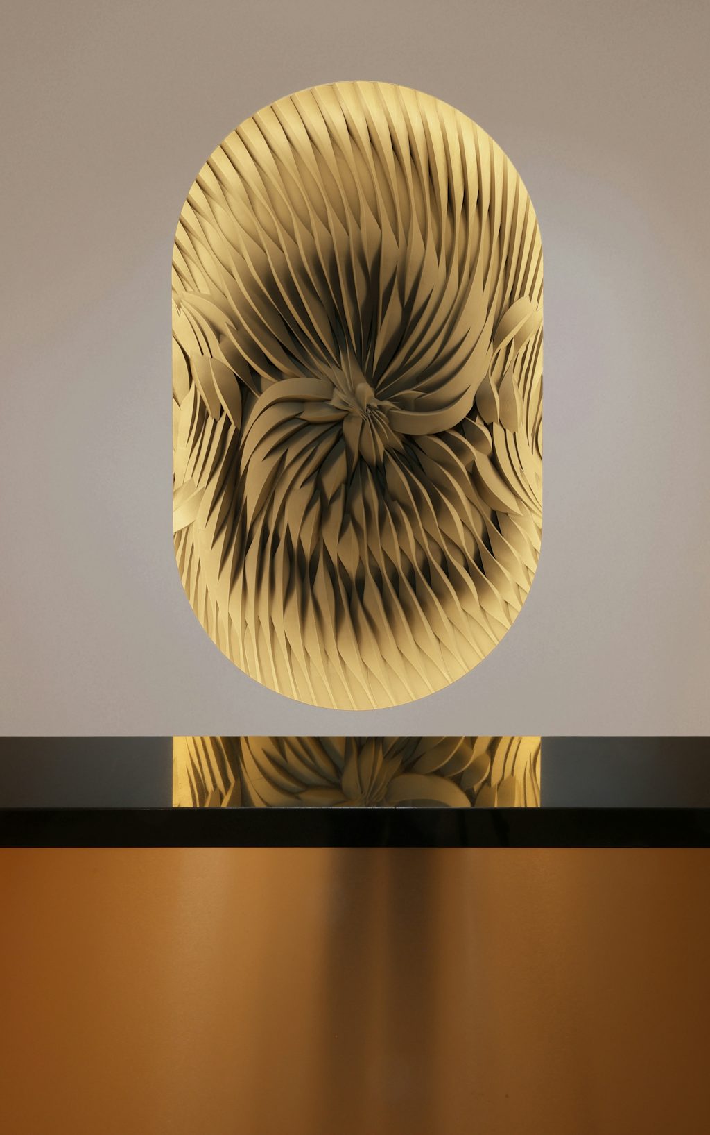 EDG partnered with Synthesis, who used their advanced algorithms to generate a dynamic pattern of linear ridges that morph and transform within the surface’s boundary. The final design captures a sculptural, bouquet-like composition, seamlessly assembled to appear as a single monolithic surface. Embedded into the wall and framed by 3D-printed knife edges, the piece is further enhanced by integrated lighting that illuminates its intricate details, seamlessly blending into the overall aesthetic while showcasing the possibilities of digital fabrication.