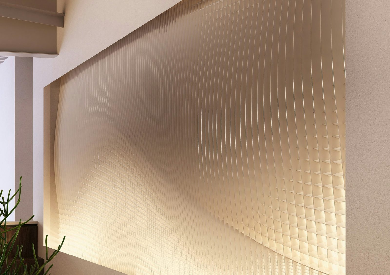 Suspended in front of a backlit wall, the intricate lattice structure allows light to cascade across its undulating fins, creating a dynamic sense of depth. The varying thickness of the printed elements produces a mesmerizing moiré effect as visitors move through the space. To achieve a refined finish, an automotive expert meticulously coated the 20-foot-wide piece, enhancing its sculptural presence and seamless integration into the lobby’s design.