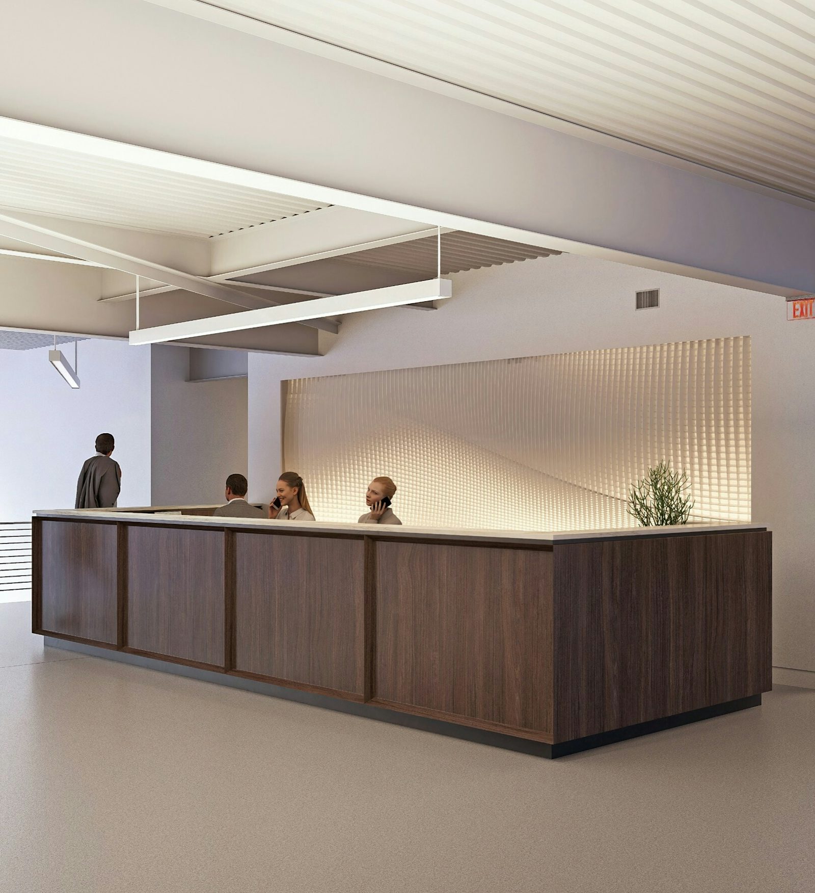 Skyline’s reception area in Long Island City lacked a distinctive character and practical functionality.