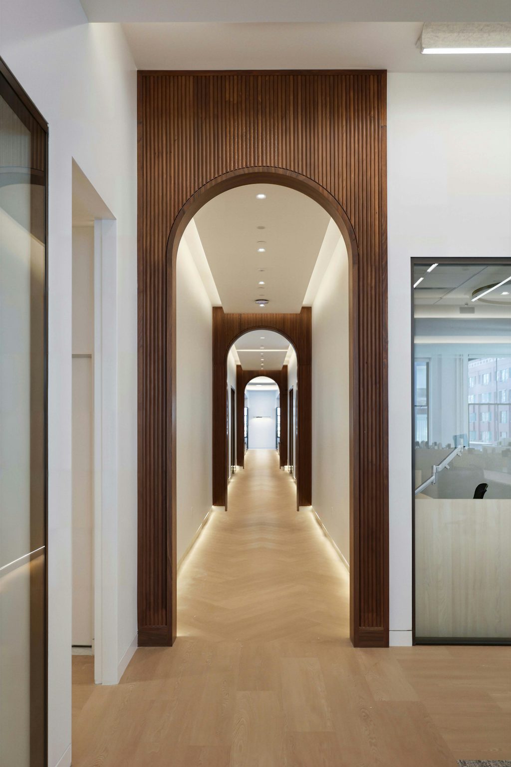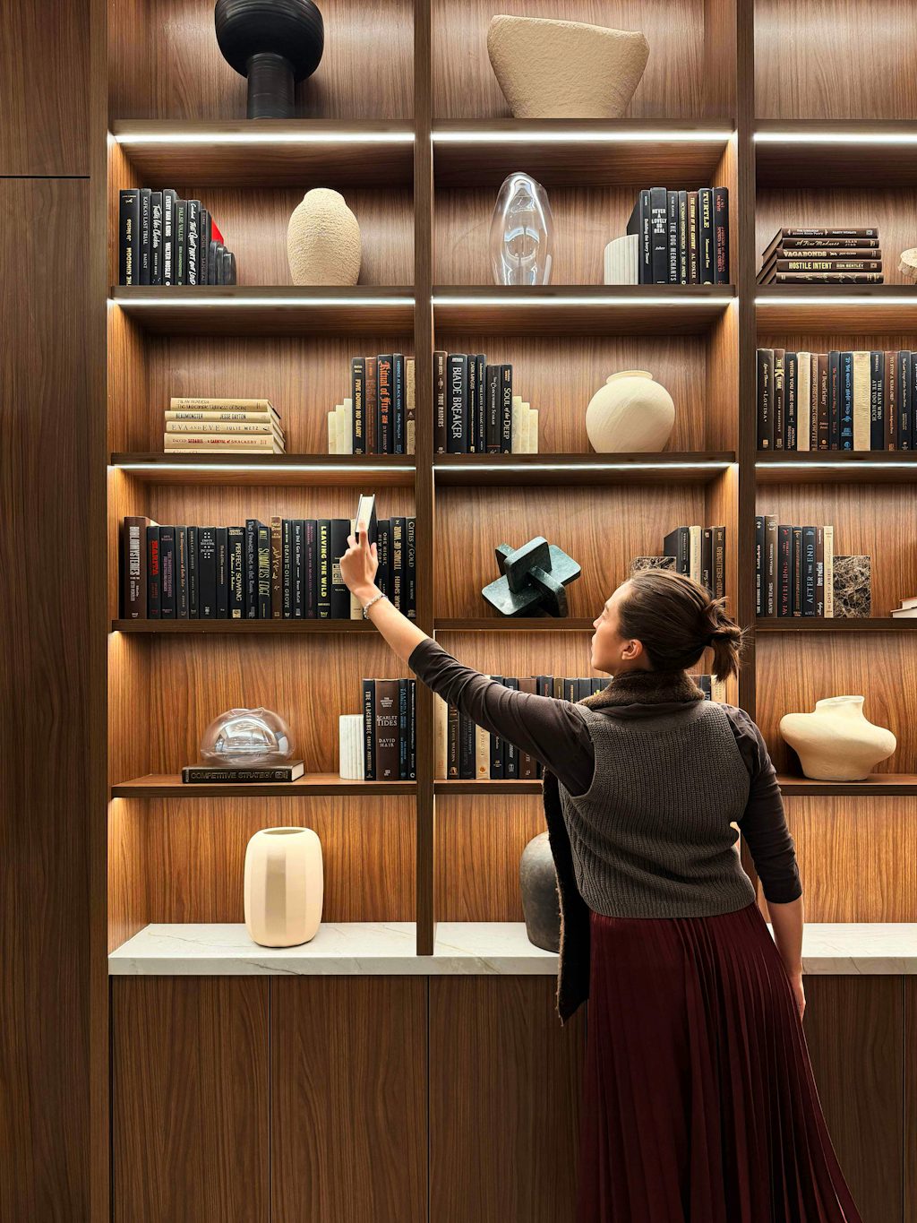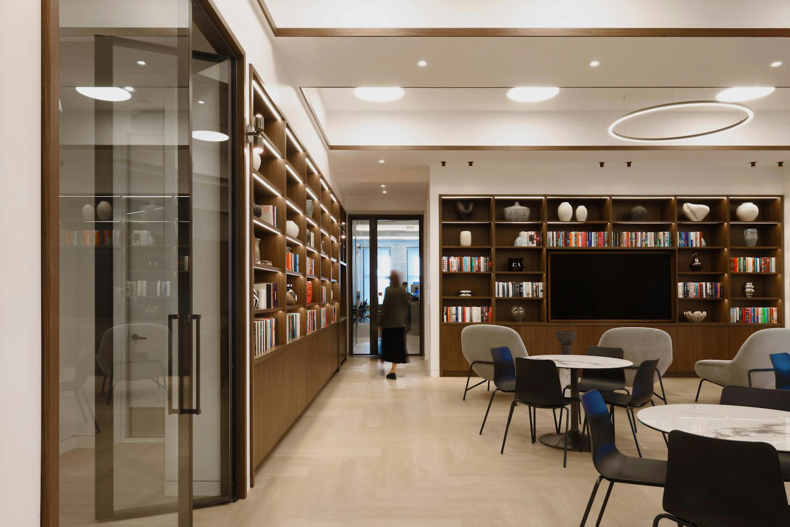 They wanted a welcoming feel that moved away from the typical austere corporate environment. With employees spending long hours in the office, the space needed to address a wide range of personalities and work styles. Our team made gathering spaces, like a versatile cafeteria that transforms into an elegant dining area for impromptu dinners, central to the design. We focused on fostering creativity and comfort while incorporating a sense of whimsy, reflecting the firm’s culture and setting it apart from more opulent competitors.