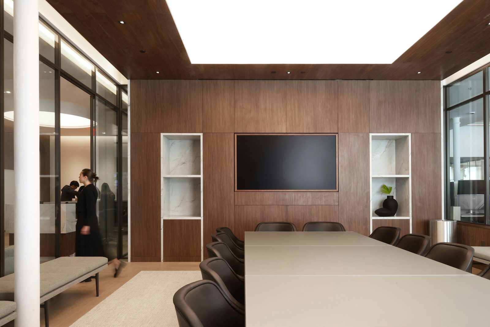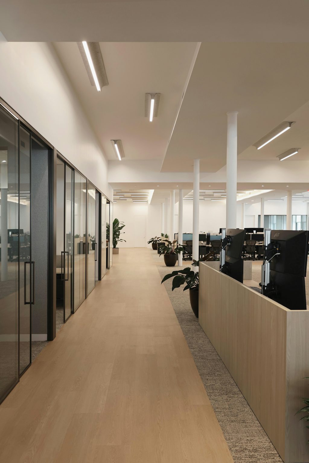 The layout features an open office environment that encourages collaboration between traders and technologists, supported by custom-built trading desks and carefully integrated technology. Private phone booths, executive offices, and acoustically treated areas were subtly customized for different departments, addressing each team’s specific needs while maintaining a cohesive aesthetic. We focused on creating spaces where employees could work and gather, with elements like a chef’s kitchen and barista bar providing a comfortable yet sophisticated atmosphere. The blend of high-end finishes—such as warm wood paneling and mirror-backed walls—adds refinement without overwhelming the space.
