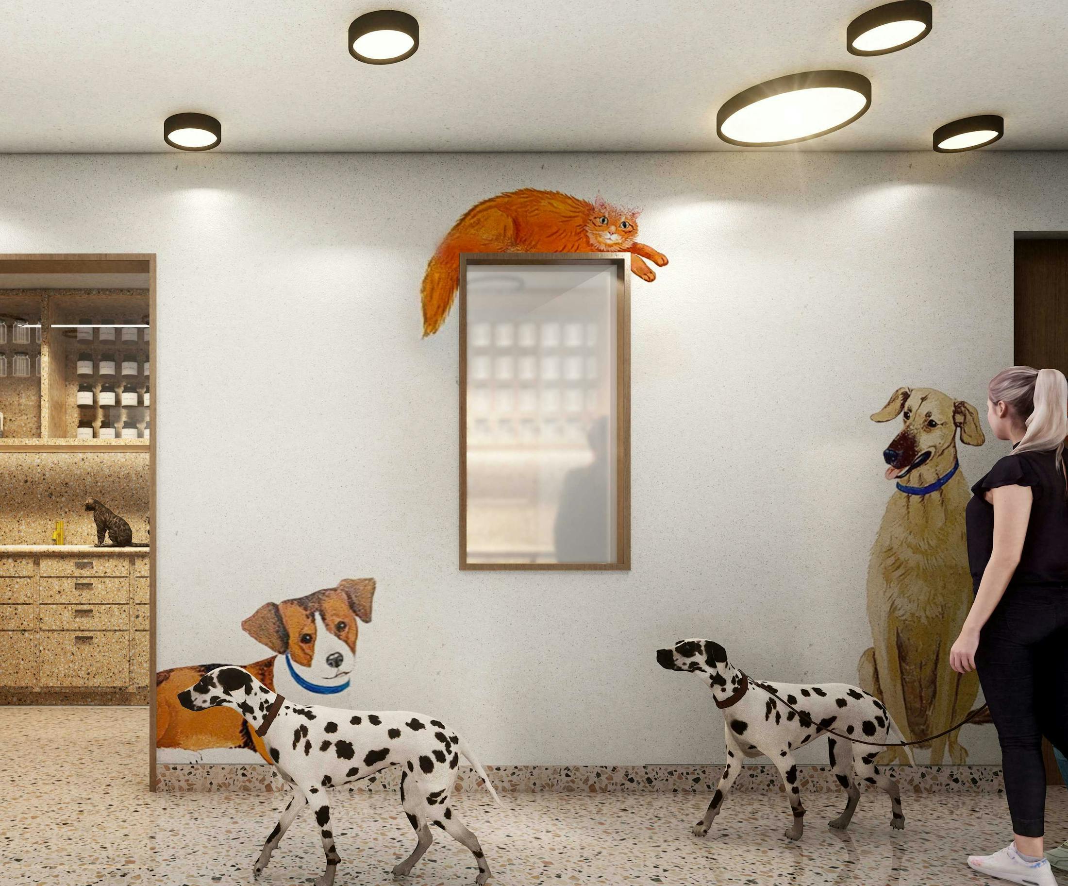 The layout reimagines the facility’s compact footprint to create a welcoming flow between the lobby, exam rooms, pharmacy, and office areas, with carefully integrated acoustic treatments enhancing comfort for both visitors and animals. Custom bench seating along storefront windows offers both function and warmth, while interior doors and finishes were tailored to support access control and ADA compliance. Hand-drawn murals printed on textured wallpaper bring character and visual interest to the space, transforming plain walls into meaningful focal points. A mix of lighting fixtures and refined materials creates an atmosphere that is both calming and professional.