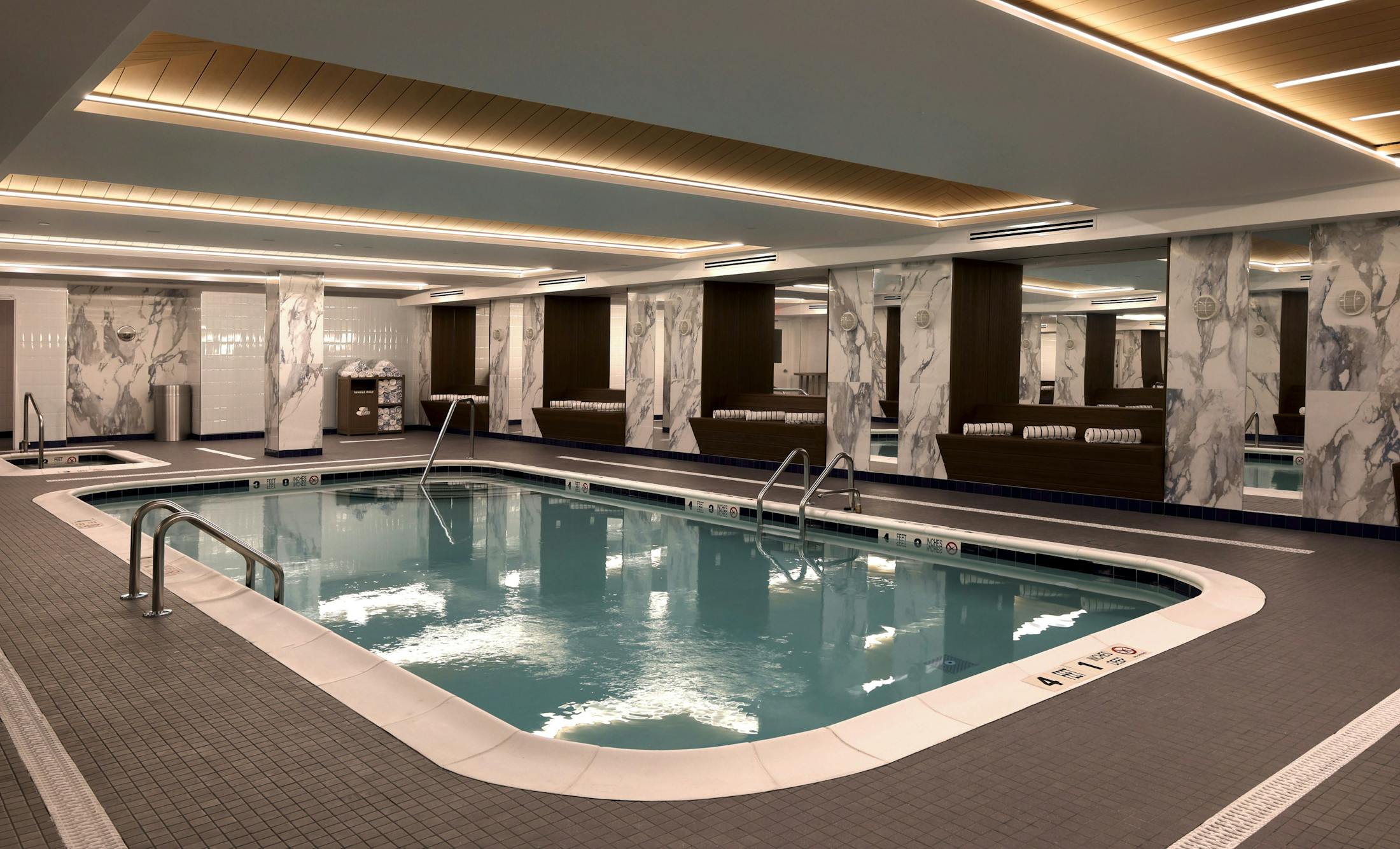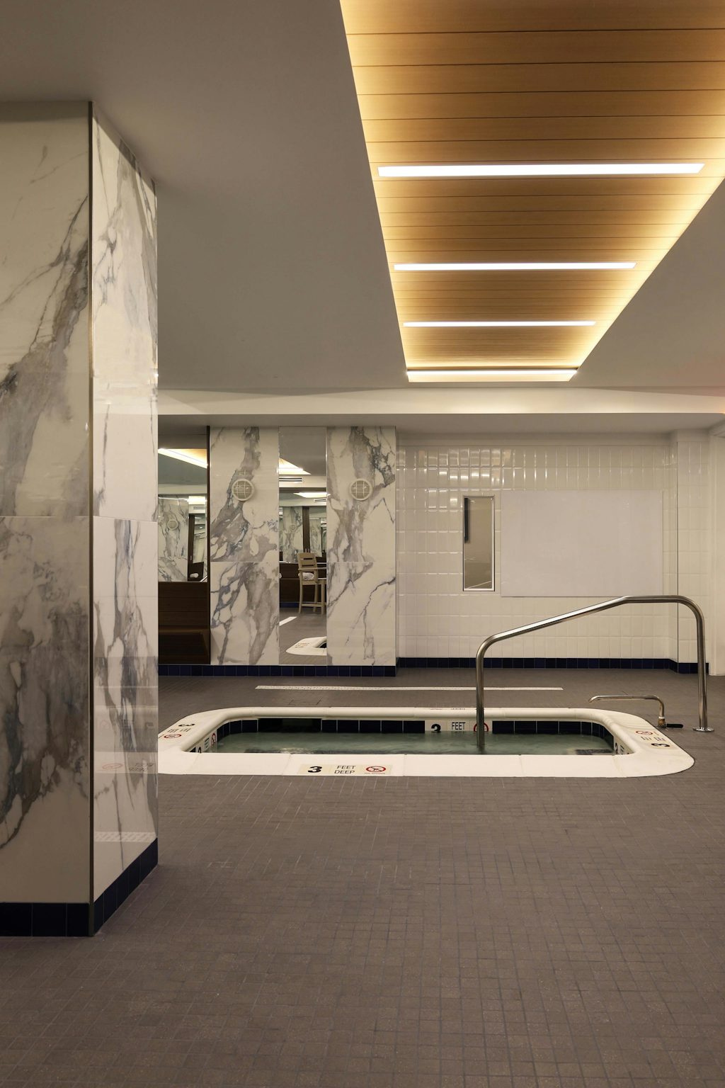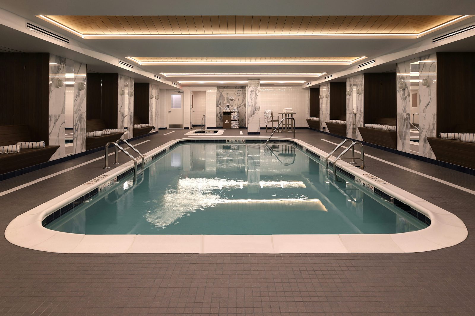 Our restoration team has been restoring the historic façade since 2008, including its iconic copper dome. Impressed with our restoration work, Montauk Manor engaged our design team to revitalize their indoor pool and amenity spaces. Low ceilings, antiquated materials, and lackluster lighting were just a few of the challenges we faced, along with a limited budget and the client's high aesthetic ambition. Our design delivered the desired sumptuousness anticipated by ownership, and we created a unified, lofty, and luxurious space for the guests—all while meeting the budget target.