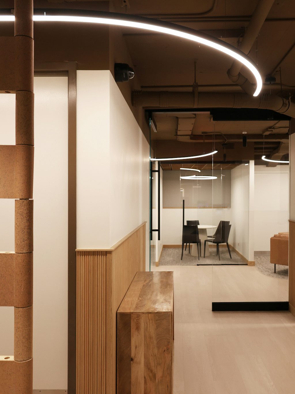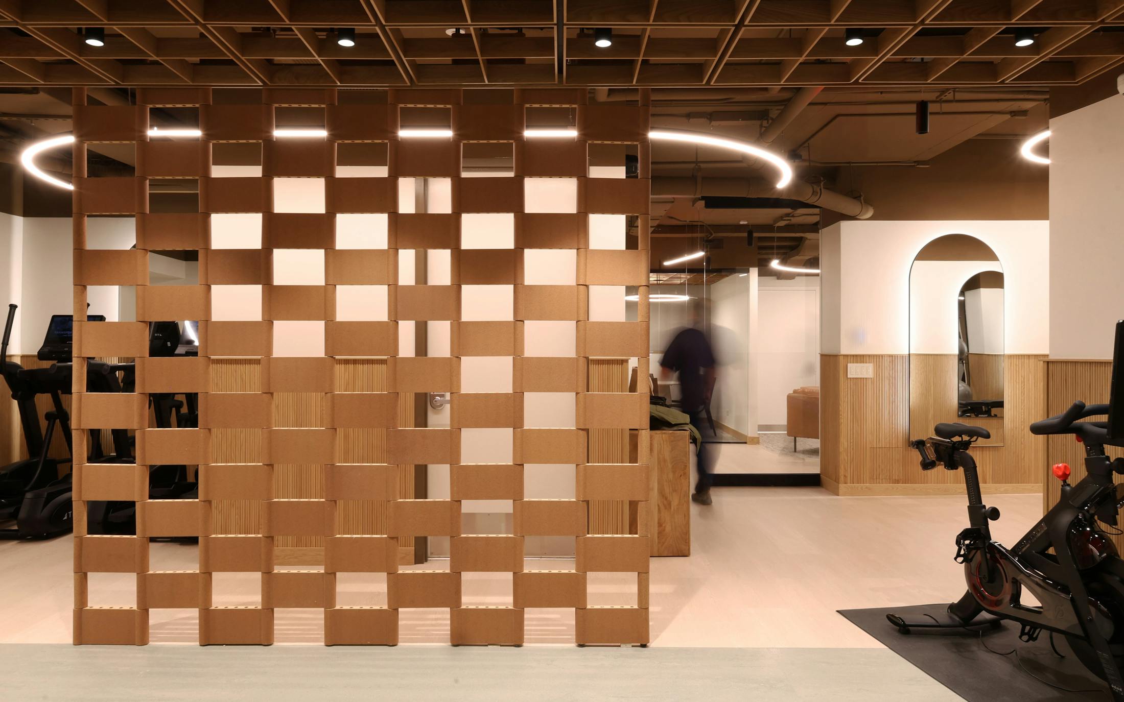 We explored the program’s dual uses through a spatial lens by focusing on flow, light, and materiality to support both active and quiet activities. To ensure code compliance, we evaluated existing conditions and tailored access requirements around egress restrictions. The material palette was curated to convey a high-end feel within budget, favoring natural tones and textures that elevate the user experience. With limited ceiling clearance, we strategically avoided excessive dropped elements, using lighting and finishes to maintain openness while reinforcing the space’s inviting tone and purpose.