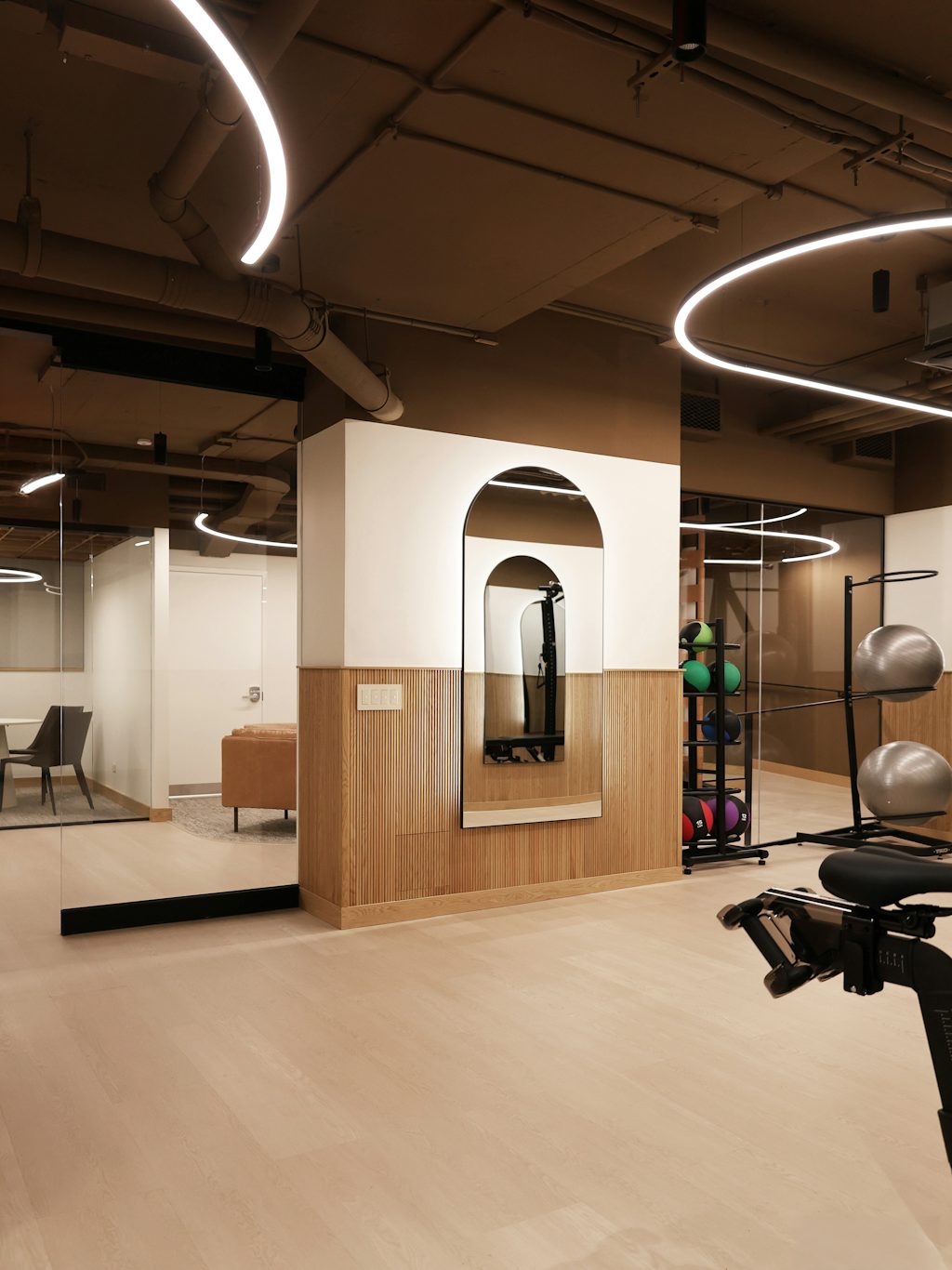 Algin Management approached EDG to convert a vacant back-of-house space into a multifunctional tenant amenity that could serve as both a gym and a co-working lounge. The goal was to enhance tenant experience while increasing property value through added functionality and revenue opportunities. EDG was tasked with creating a high-end yet budget-conscious material palette, optimizing the layout for both fitness and workspace zones, and overseeing the design from development through construction to ensure a cohesive and inviting final product. Egress limitations and spatial constraints added complexity, but also framed the opportunity for a truly thoughtful transformation.