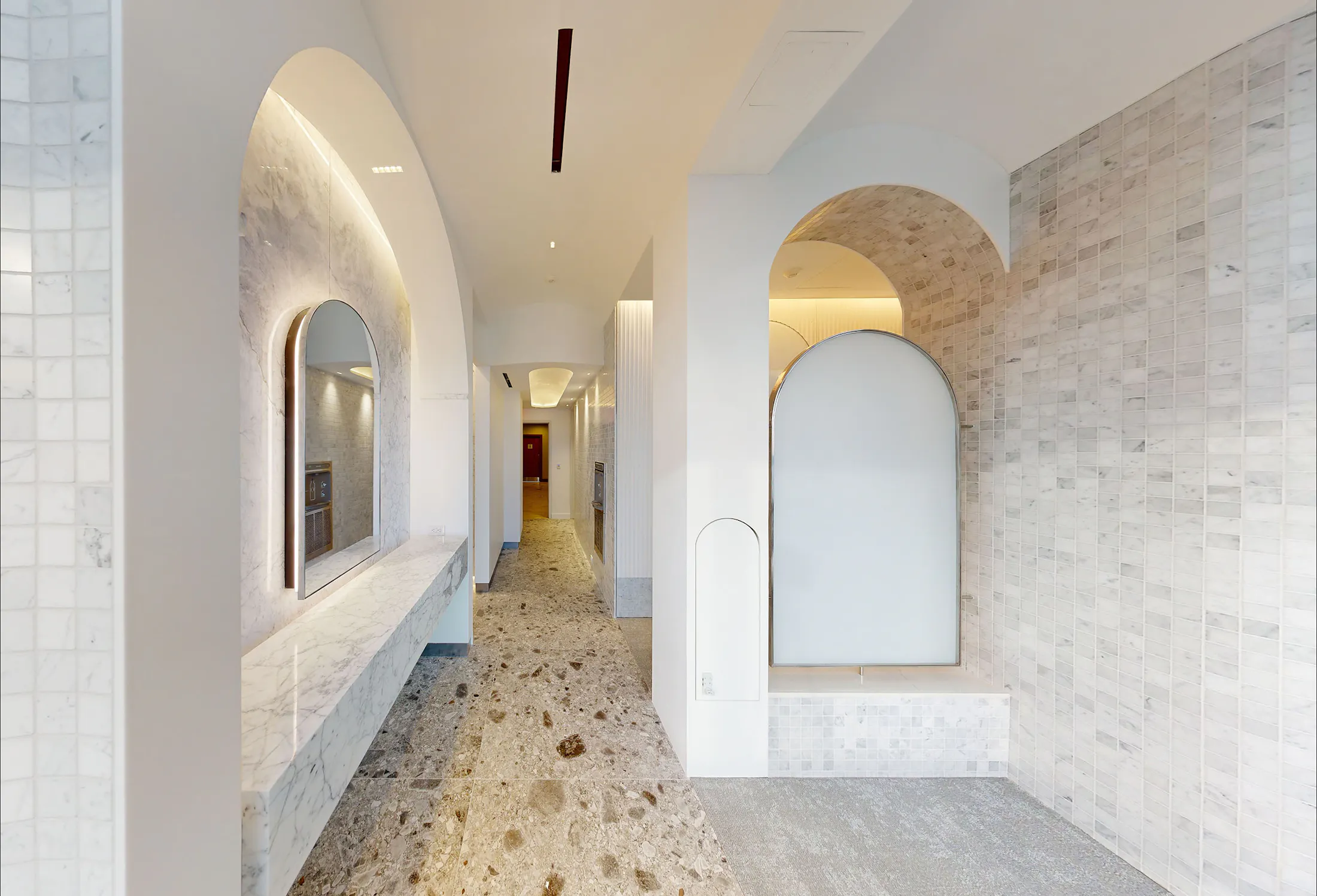 We drew inspiration from the structure's original geometry and materiality, using these elements as a foundation for the renovation. A refined palette of luxurious materials, including exotic marbles, scalloped concrete, and sintered stone, was selected to create timeless and sophisticated spaces. Each area was thoughtfully reconfigured and redesigned, with particular attention to lighting and spatial flow, to ensure that the new amenities offer functionality and an immersive experience of warmth and calm.